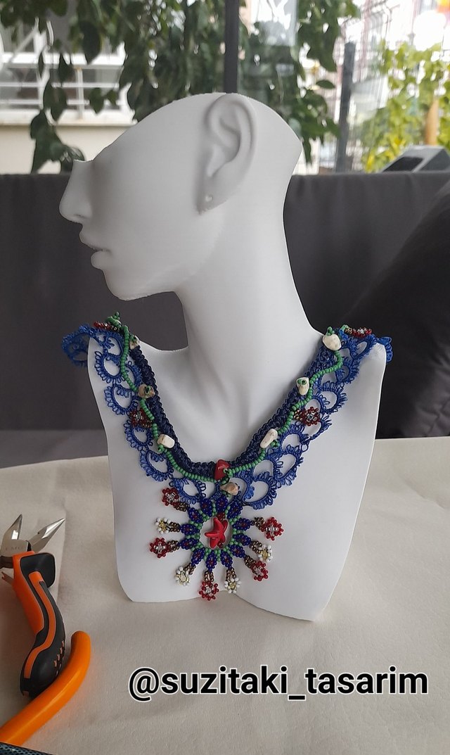 Boncuk işlemeli, çok renkli uzun bohem kolye, işlemeli detaylarla parti için uygundur. Üzerinde '@suzitaki tasarim' imzası bulunur.