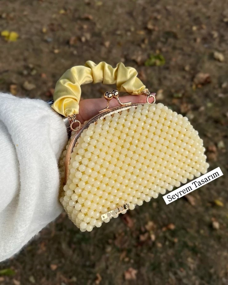 Boncuk işlemeli sarı triko kadın çantası, buruşuk saplı, bohem ve ışıltılı tarz için uygun.
