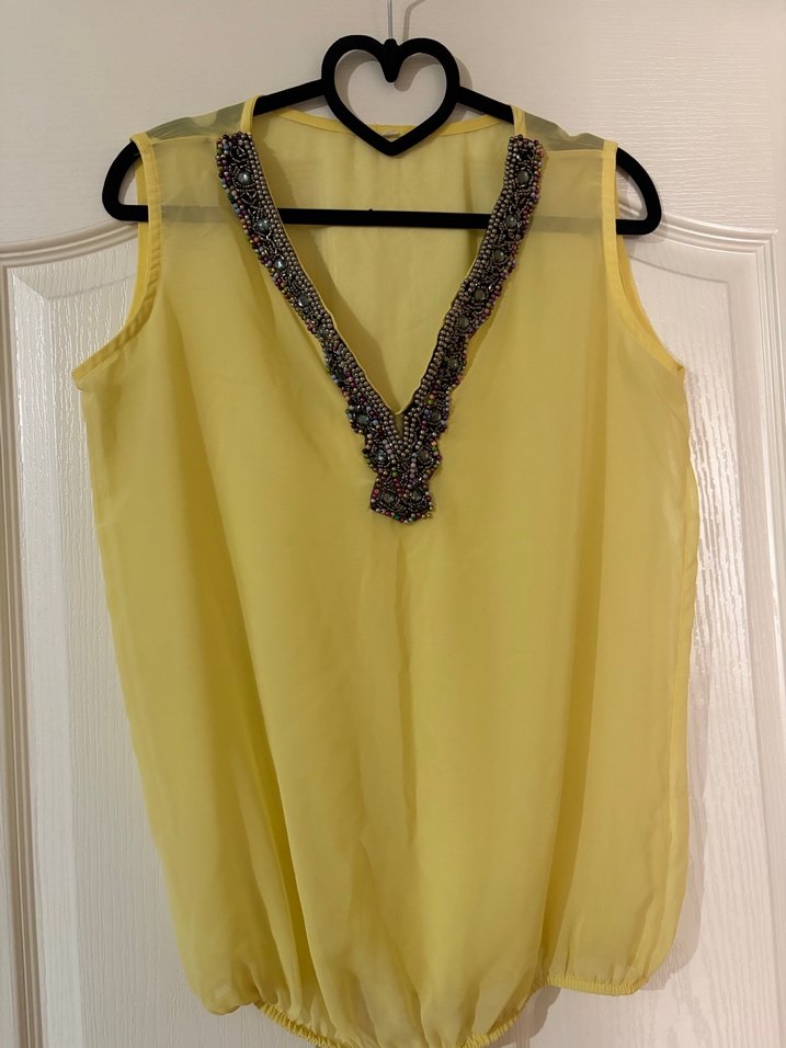 Boncuk işlemeli V yakalı, kolsuz, bol kesim, parlak sarı ipek görünümlü midi uzunlukta kadın bluz. Bohem tarzını yansıtır. L beden