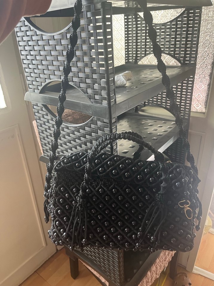 Boncuk işlemeli, sentetik kumaştan siyah el çantası, örgülü askılarla bohem ve gotik tarzı yansıtıyor. Günlük kullanım için uygundur.