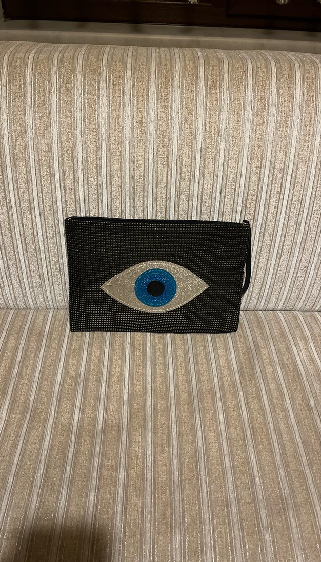 Sentetik kumaştan yapılmış, boncuk işlemeli ve işlenmiş göz desenli siyah bohem tarzı günlük kullanıma uygun kadın clutch çanta.