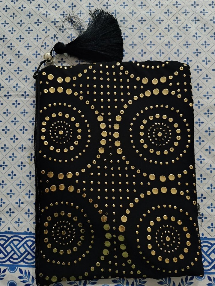 Boncuk işlemeli dairesel desenlere sahip siyah portföy çanta, püskül detaylıdır. Sentetik kumaştan, bohem tarzda üretilmiştir.