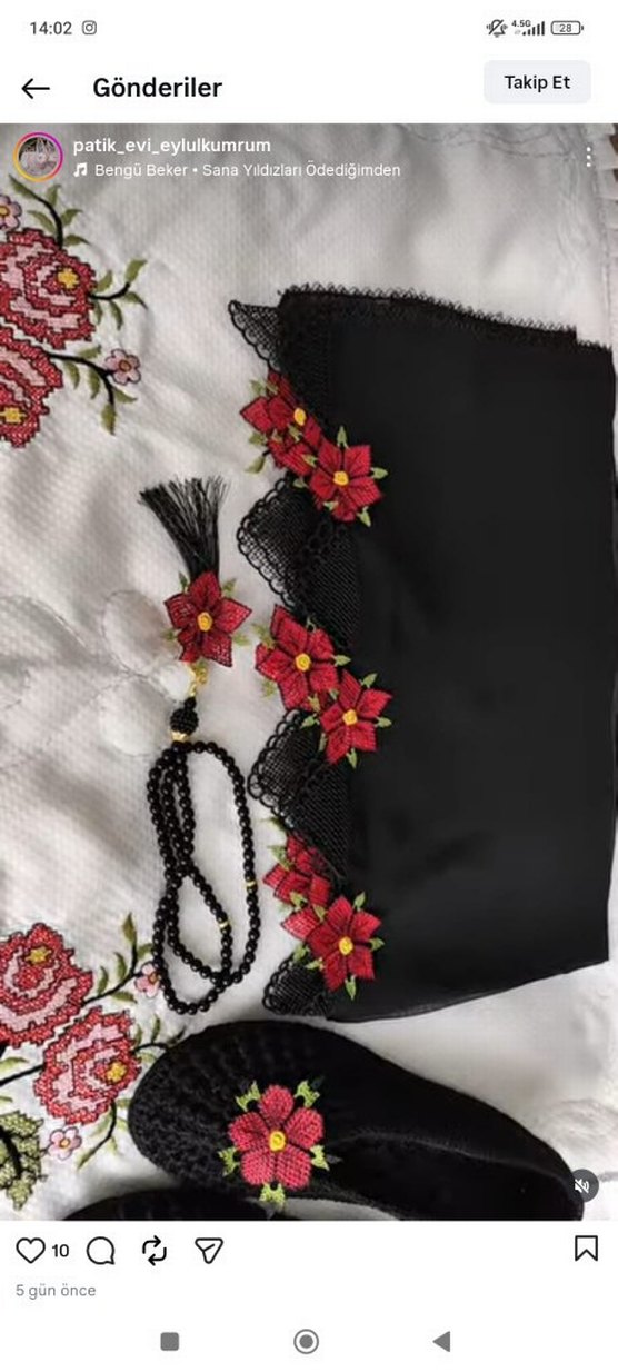 Boncuk işlemeli, kenarları kırmızı çiçeklerle süslü siyah şal, sentetik kumaştan ve bohem tarzda.