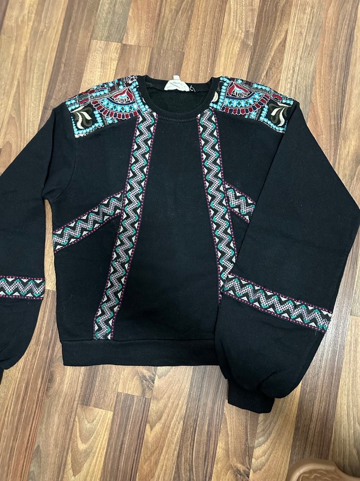 Boncuk işlemeli, nakışlı bohem desenlere sahip, siyah, uzun kollu, yuvarlak yakalı bol kesim sweatshirt. ✨