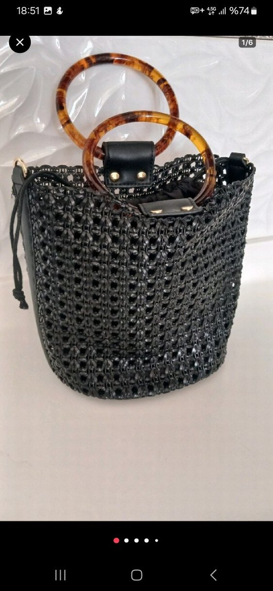 hasır işlemeli siyah deri kadın çantası, yuvarlak kaplumbağa kabuğu saplarla bohem tarzda, günlük kullanıma uygun.