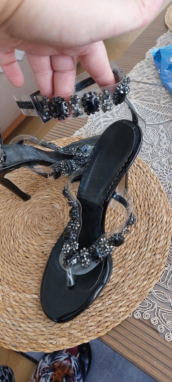 Boncuk işlemeli ve işlemeli detaylara sahip siyah dolgu topuklu kadın ayakkabısı. Kauçuk malzemeden yapılmıştır, düğünler için uygundur. ✨