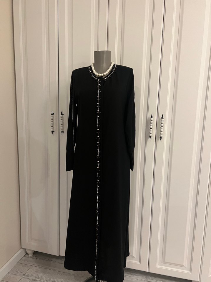 48 santim kol altı bu ise 1 metre 28 santim Çok iyi durumda Medine ipeği kol manşeti esnek Fiat 500 TL Boncuk işlemeli, siyah uzun kollu uzun elbise, mod kesim ve işlemeli detaylara sahip. İpek gibi yumuşak kumaştan, günlük kullanıma uygun.
