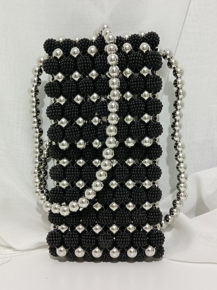 Boncuk işlemeli siyah gümüş telefonluk desenli örgü kumaş ve gotik stil ile şık bir görünüm sunar. Günlük kullanım için uygundur.