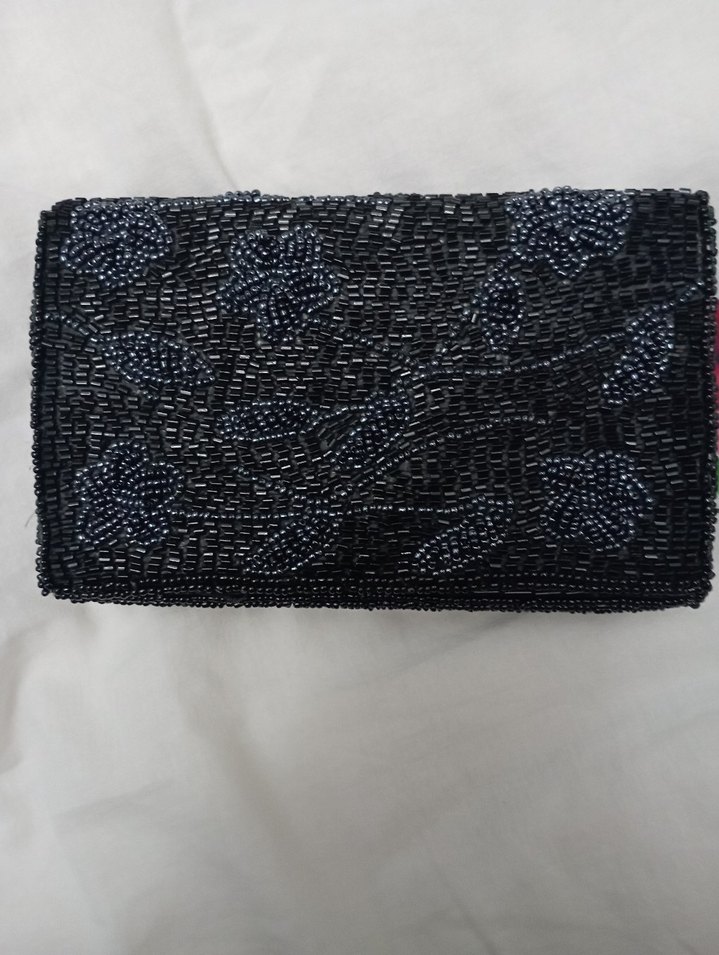 Siyah, boncuk işlemeli ve nakış detaylı, sentetik kumaştan yapılmış kadın portföy çanta, çağdaş minimalist tarzda.
