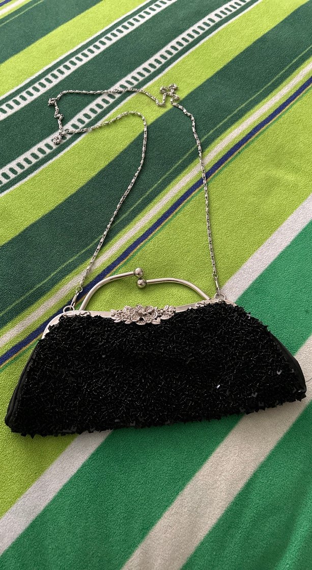 Boncuk işlemeli siyah portföy çanta, gümüş zincir askılı ve vintage tarzı metal tokalı. Partiler için uygun şık bir modeldir.