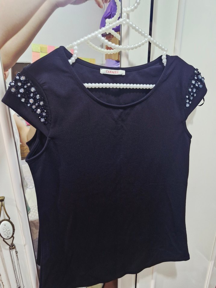 Siyah, pamuk kumaştan, kısa kollu ve boncuk işlemeli detaylara sahip, dar kesim kadın bluz. Günlük kullanıma uygundur.