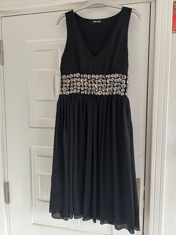 Siyah, kolsuz midi elbise, V yaka ve bol kesim. Bel kısmında boncuk işlemeli detay bulunur. Düğün ve gotik stil için uygundur.