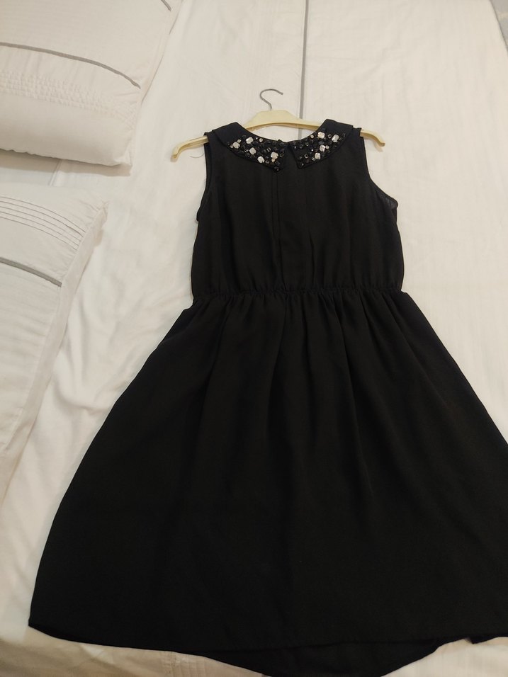 Boncuk işlemeli yakalı, kolsuz siyah midi elbise. Gevşek kesimiyle gotik tarz partiler için uygun.