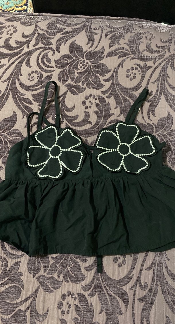 Boncuk işlemeli çiçek desenli siyah mini büstiyer, bol kesim. Askılı ve straplez yaka stili, sentetik kumaştan. Bohem ve goth tarzına uygun.