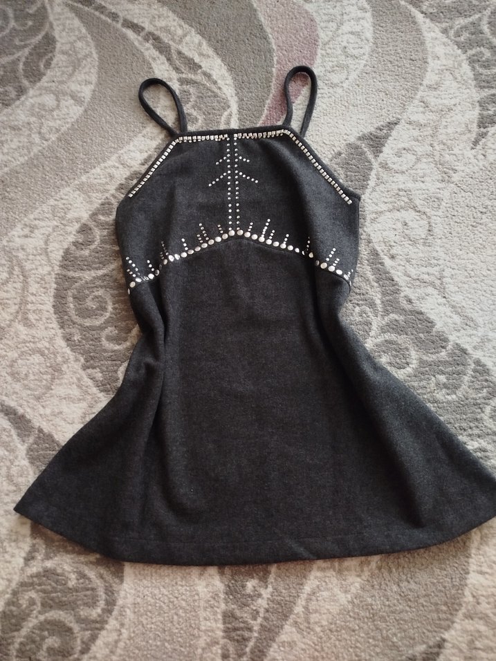 Siyah, askılı, boncuk işlemeli mini elbise. pamuklu Yüksek yakalı ve vücuda oturan kesimiyle gotik ve bohem tarzı yansıtıyor. Günlük kullanıma uygun.