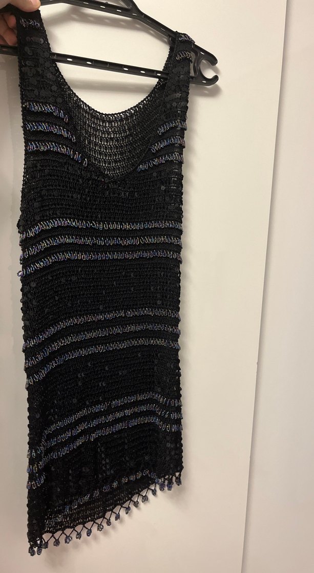Dar kesim siyah triko elbise, kayık yaka ve askılı kollara sahip, boncuklu ve işlemeli detaylarla süslenmiş, parti için uygun. 38 bedene de uygun kısa boylulara daha uygun mini bir elbise