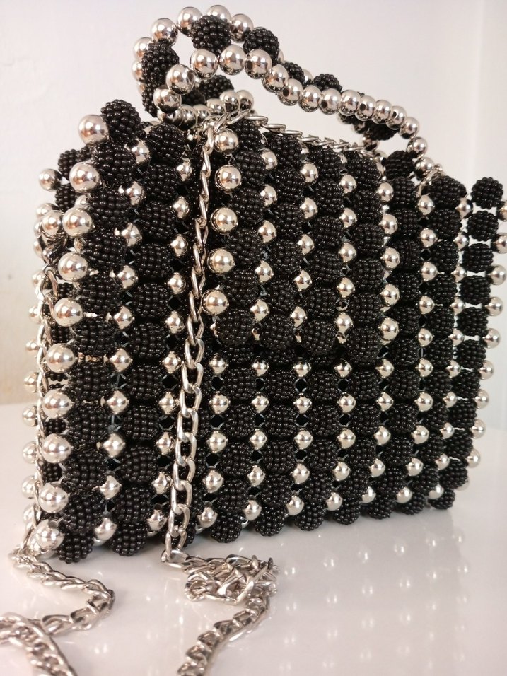 Siyah örgü kumaştan, boncuk işlemeli ve zincir askılı avant-garde tarzda kadın çanta. Astarlı