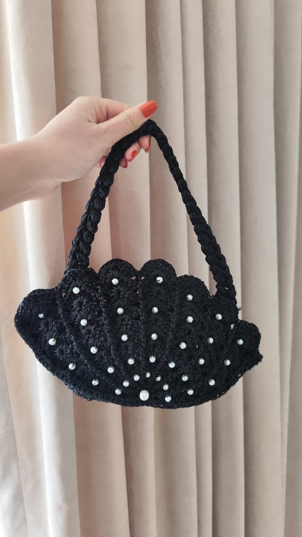Boncuk işlemeli ve işlemeli detaylara sahip siyah örgü kadın çantası, gotik stil ile bohem ve retro etkiler taşıyor. Taşıma için örgü sapı bulunur.