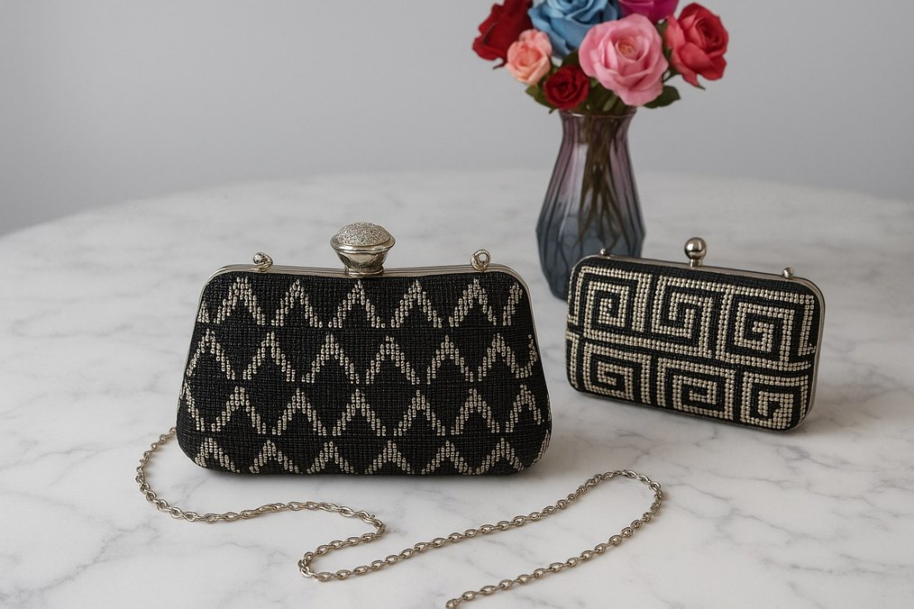 ozel tasarim el işlemesi siparişe özel de yapılır Boncuk işlemeli nakış desenli siyah örgü clutch çanta, metal zincir askılı, gece kullanıma uygun modern klasik tasarım. abiye çanta ✨