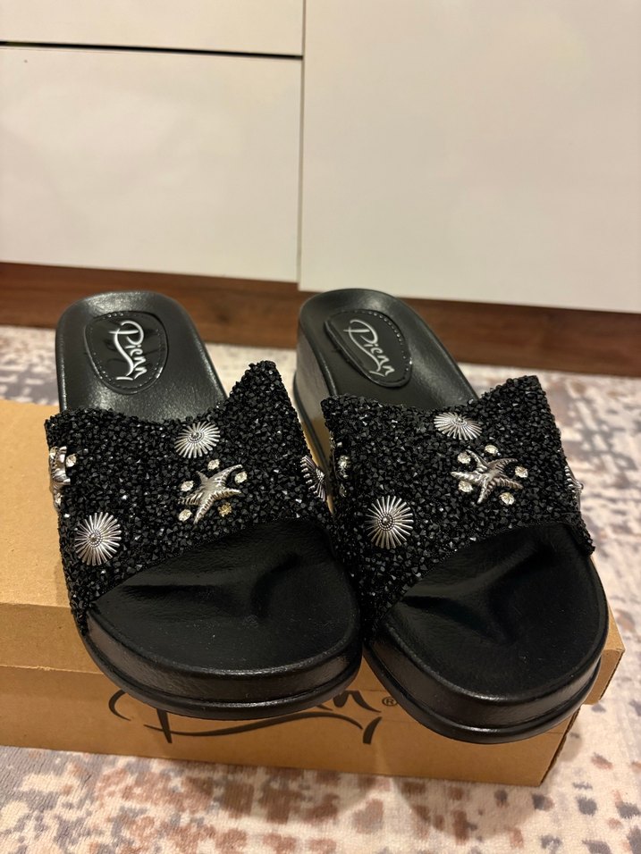 Boncuk işlemeli ve nakış detaylı siyah platform terlikler, romantik akşamlar için bohem tarzda. Rahatlık için kauçuk malzeme kullanılmış.
