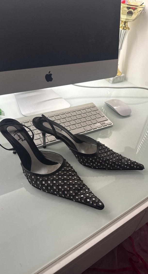 Siyah, yılan desenli ve boncuk işlemeli stiletto topuklu ayakkabı, kauçuk malzemeden, klasik şıklık için ofis ortamına uygun.