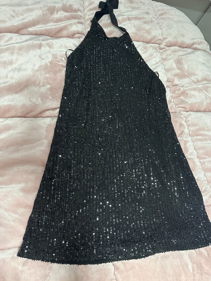 Boncuk işlemeli, uzun ve siyah renkte, halter yaka ve askılı, vücuda oturan abiye elbise. ✨