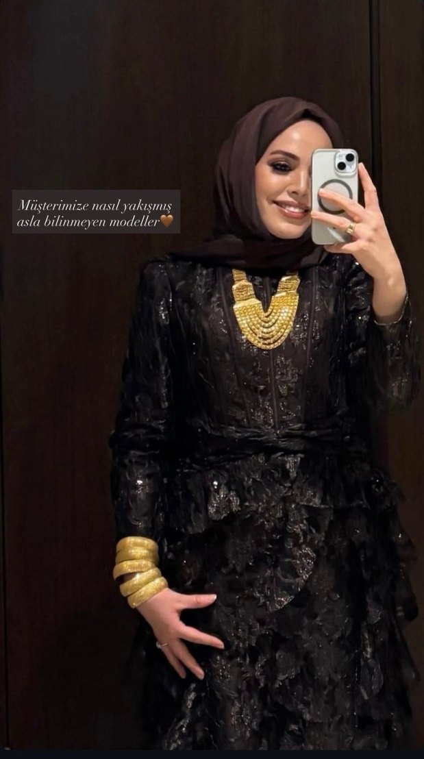 Boncuk işlemeli, yüksek yakalı ve uzun kollu siyah dar kesim abiye elbise, mütevazı düğünler için uygundur. ✨