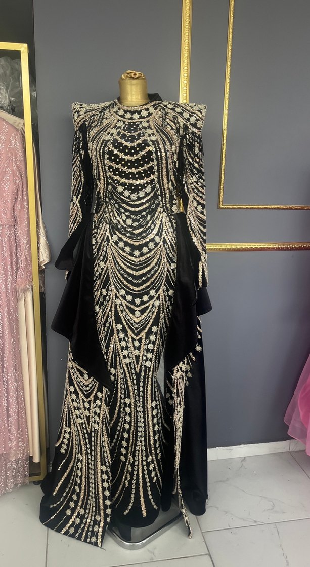 Yüksek yakalı ve uzun kollu, boncuk işlemeli siyah uzun abiye elbise. Bohem tarzda desenli, düğünler için ideal.