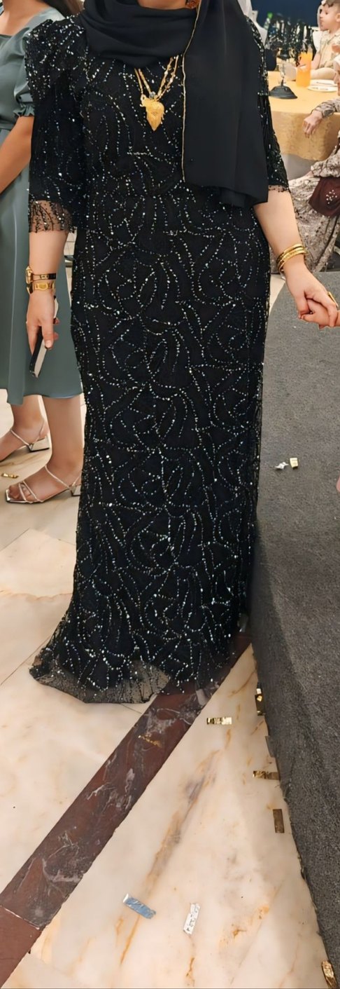 V yaka ve ince askılı, boncuk işlemeli desenlere sahip siyah, uzun ve vücuda oturan abiye elbise, partiler için şık ve göz alıcı bir tercih. ✨