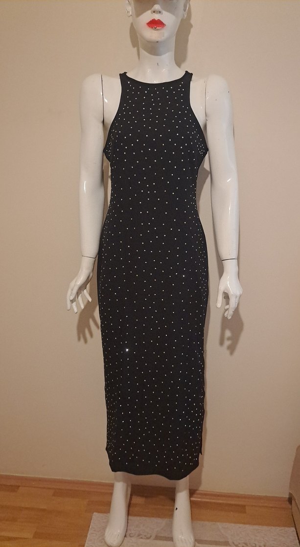 Boncuk işlemeli, siyah, uzun ve kolsuz abiye elbise, yüksek yakalı ve vücuda oturan kesimiyle gece partileri için uygundur.