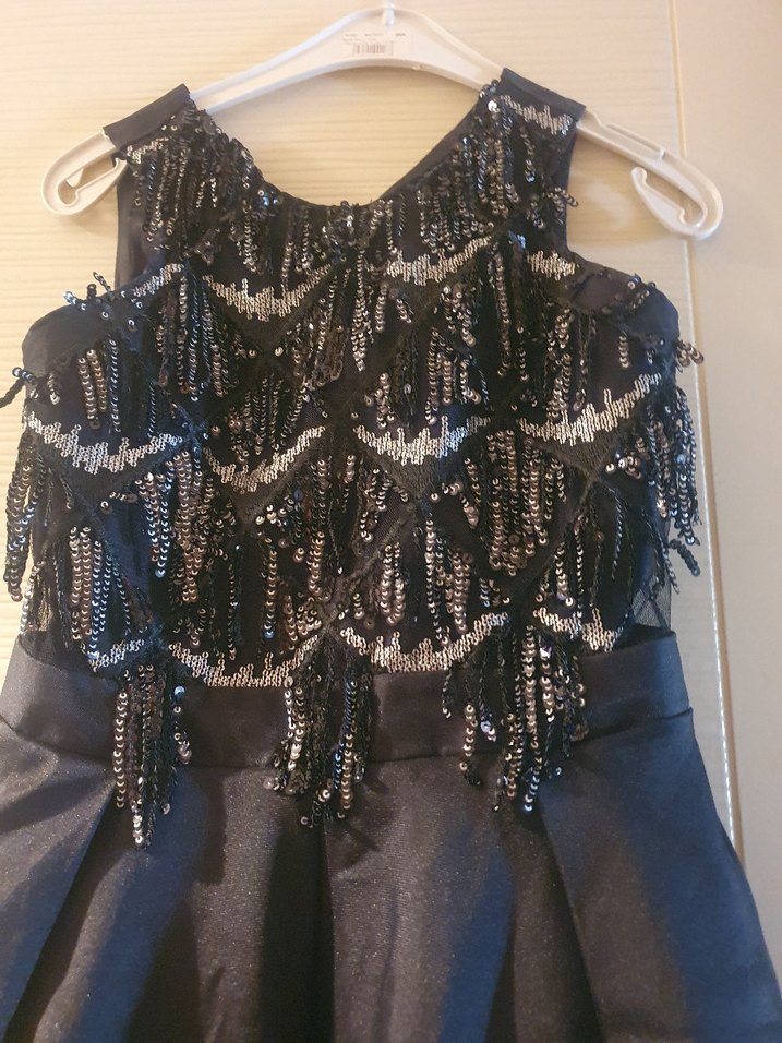 Boncuk işlemeli, straplez yakalı ve uzun siyah abiye elbise, parlak detaylarıyla parti için uygundur. ✨