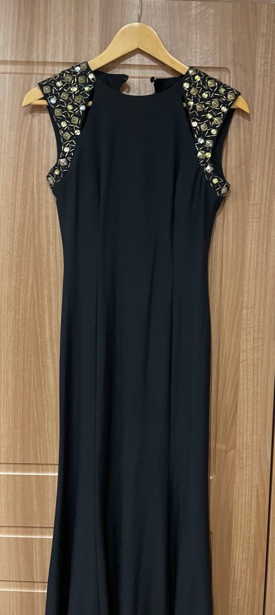 Boncuk işlemeli, işlemeli detaylara sahip, siyah, uzun ve kolsuz, V yakalı dar kesim abiye elbise. Gotik tarzını yansıtır, düğünler için uygun.