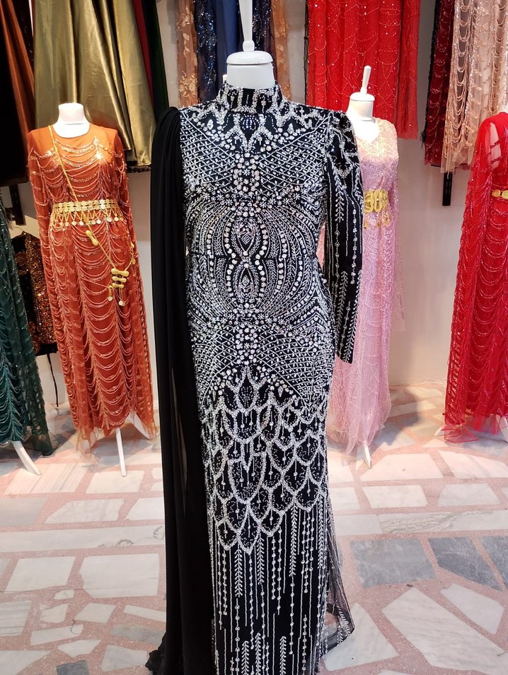 Yüksek yakalı ve uzun kollu siyah uzun abiye elbise, boncuk işlemeli desenlerle süslenmiştir. Düz kesim ve renkli detaylarla şık bir görünüm sunar.