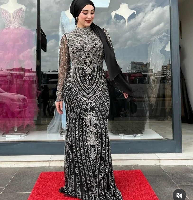 Boncuk İşlemeli Siyah Uzun Abiye Elbise
