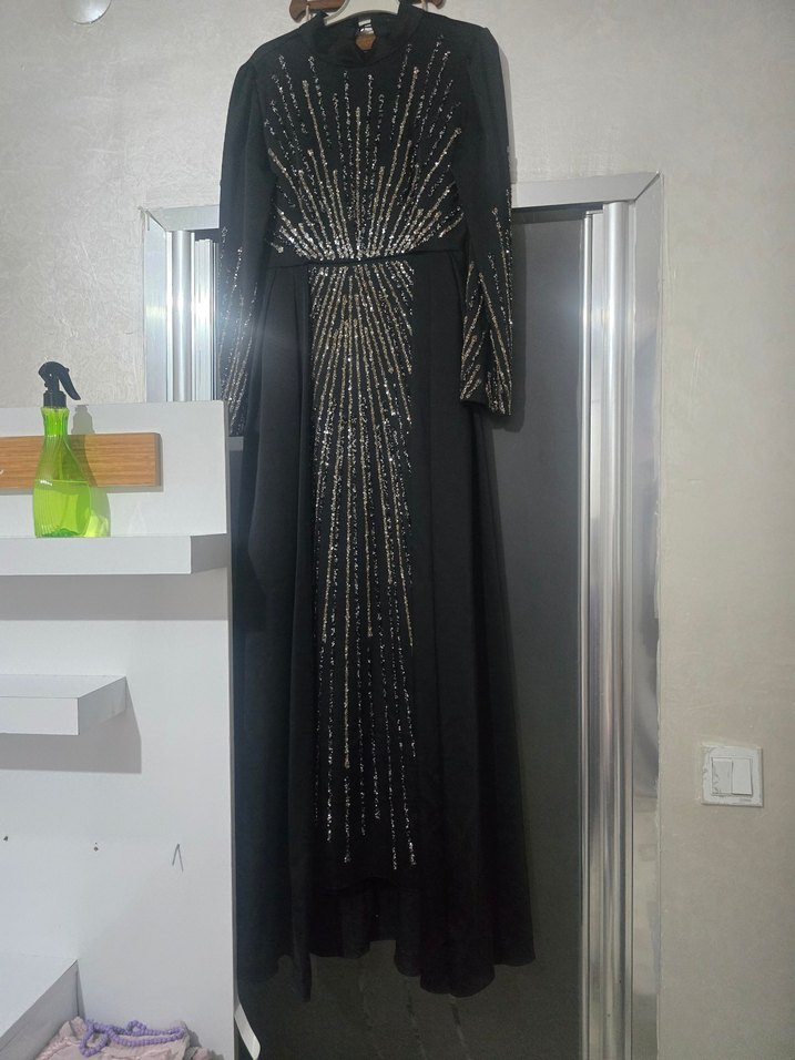 Boncuk işlemeli desenlerle süslenmiş siyah uzun abiye elbise, düzenli kesim ve yaka detayına sahiptir. Askılı kolları ile gotik ve gösterişli bir tarz sunar. ✨