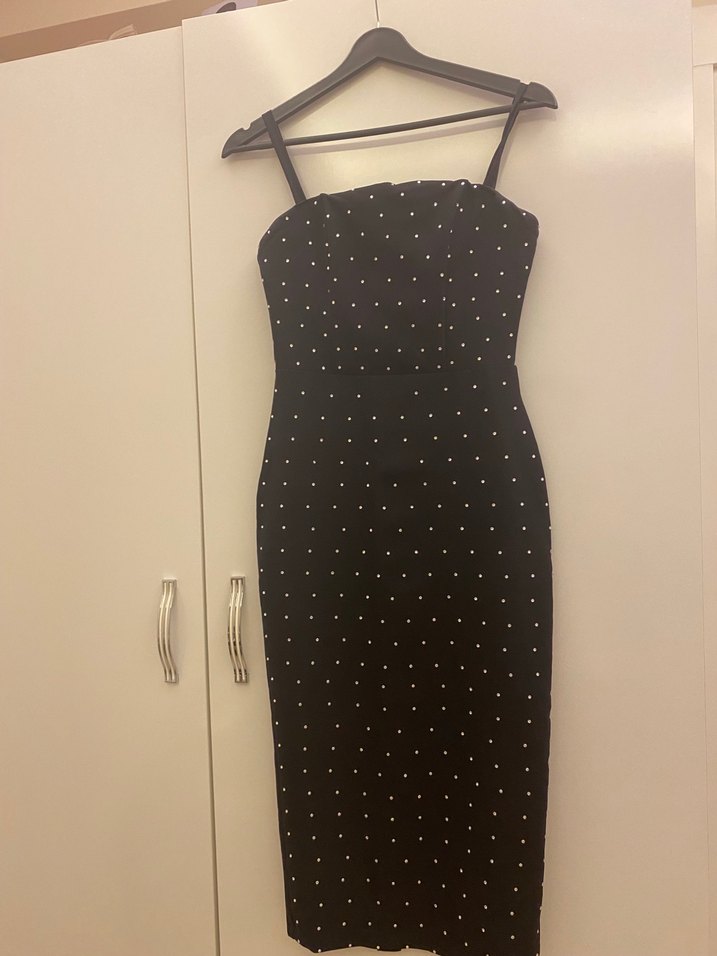 Boncuk işlemeli puantiyeli siyah, uzun ve vücuda oturan askılı elbise, romantik buluşmalar için uygundur. ✨