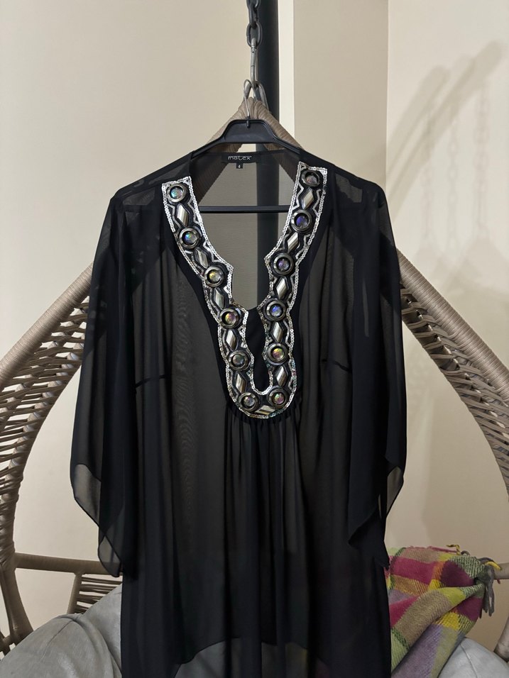 Boncuk işlemeli V yakalı, siyah uzun tunik. İpek gibi kumaştan, salaş kesim ve kolsuz, bohem tarzını yansıtıyor.