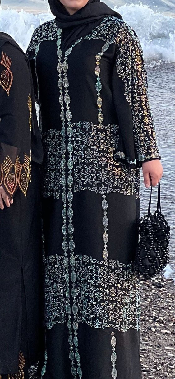 Boncuk işlemeli ve nakışlı desenlere sahip, notched lapel yakalı ve askılı kollu siyah uzun hint elbisesi. Modest ve klasik tarza uygun, düğünler için ideal.