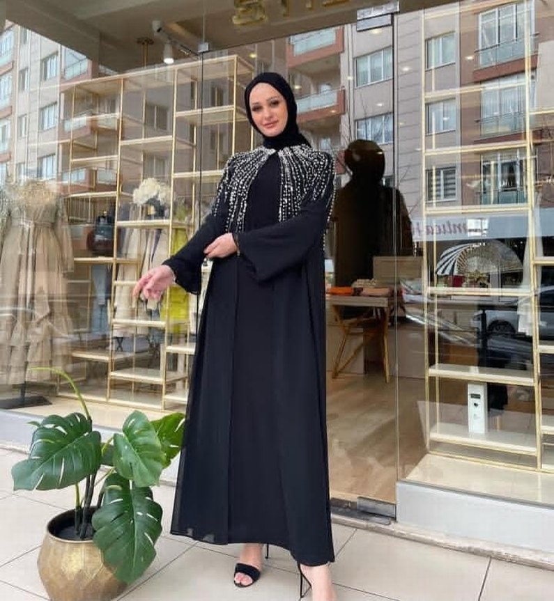 Siyah uzun elbise, straplez yaka ve uzun kollu, etnik boncuk işlemeli detaylara sahiptir. Yumuşak sentetik kumaştan üretilmiş, düzenli kesim, mütevazı ve göz alıcı sokak stili için uygundur. Günlük kullanım için idealdir. ✨