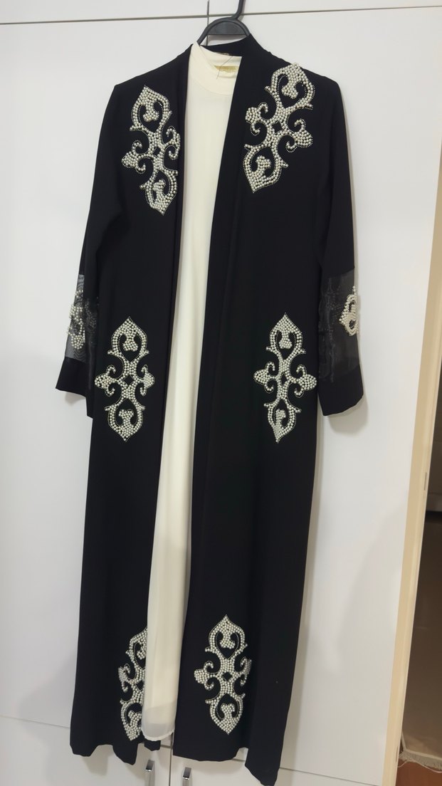 Siyah uzun kollu, yakası kesik uzun elbise. İşlemeli ve boncuklu detaylara sahip, ipeksi dokulu, sade ve rahat kesim, . 1 defa giyildi abiye sınıfına giriyor iç elbisesi de beraberinde takım olarak verilecek şu an magzasında 5000 tl