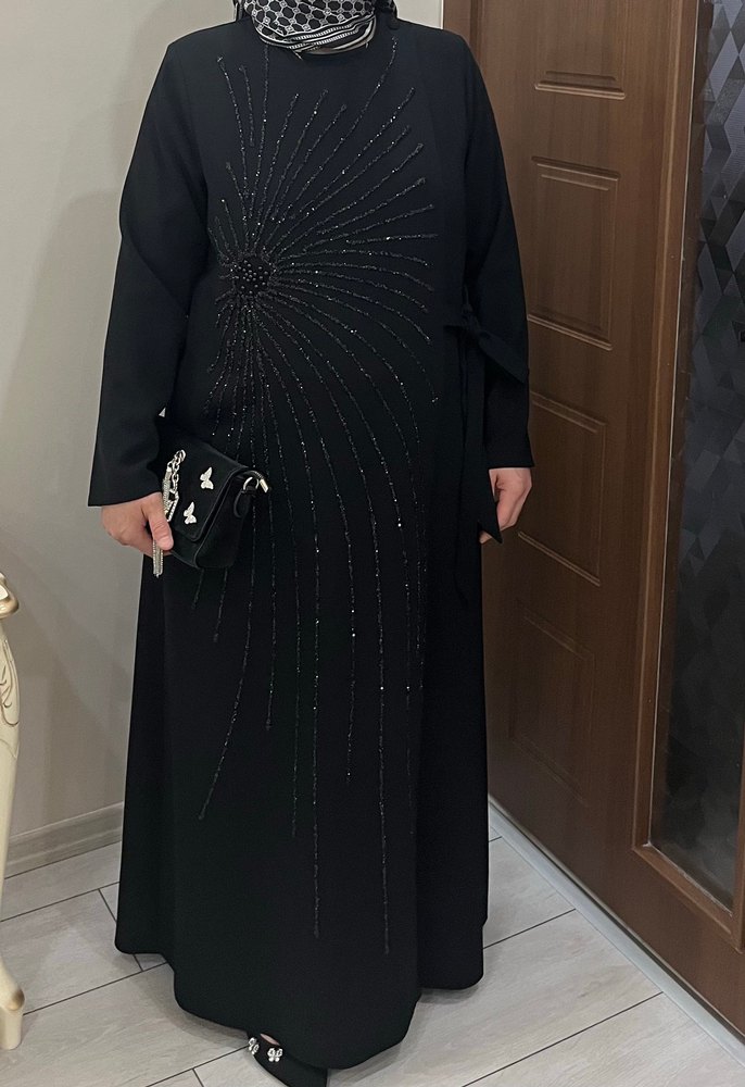 Siyah uzun elbise, boncuk işlemeli desen ve yüksek yakalıdır. Sentetik kumaştan, regular fit kesim ve uzun kolludur, günlük kullanıma uygundur. yandan bağlamalı birkaç saatliğine nişanda giydim ferace modelinde