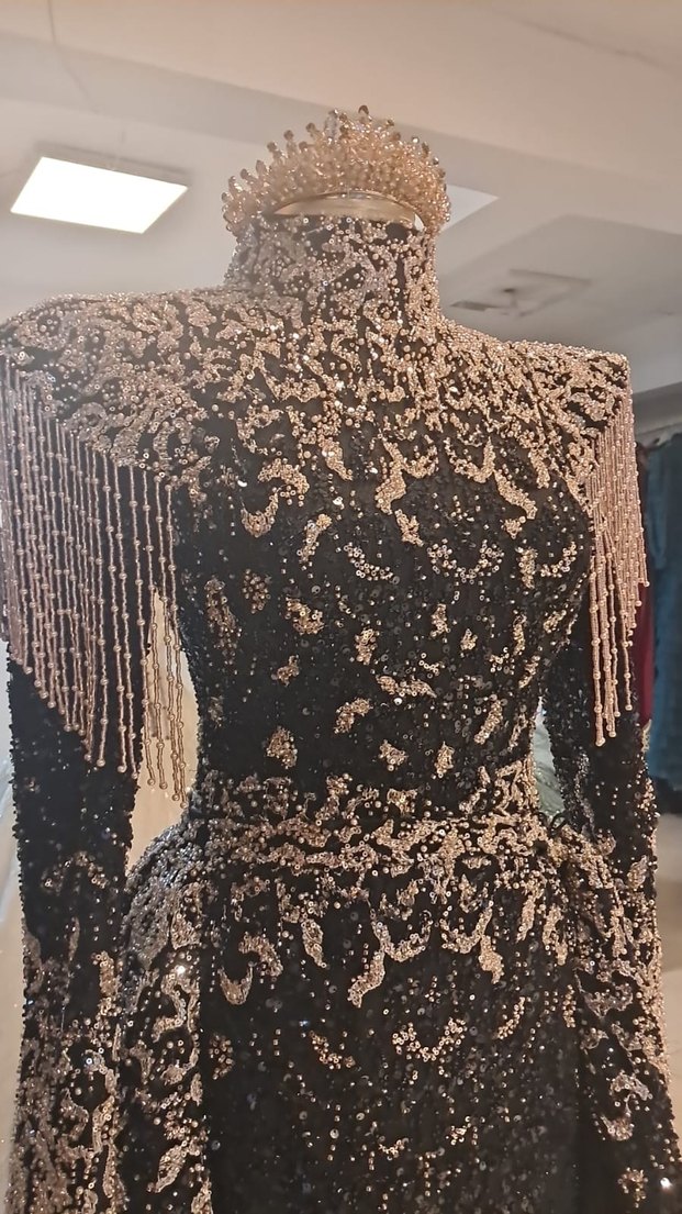 Boncuk işlemeli, yüksek yakalı ve uzun siyah henna elbise. Omuzlarda boncuklu püskül detaylarıyla, düğünler için şık ve dikkat çekici bir model. ✨