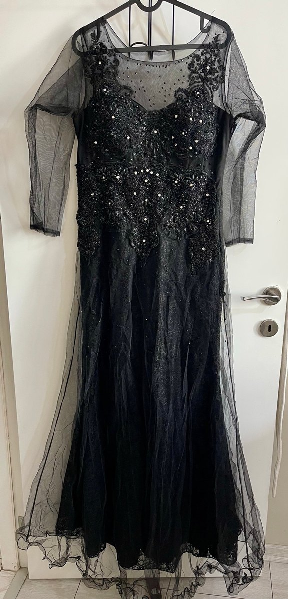 Boncuk işlemeli, nakış detaylı, uzun kollu ve tekne yaka, siyah renkli, klasik şıklıkta, fitted kesim kadın abiye elbise.