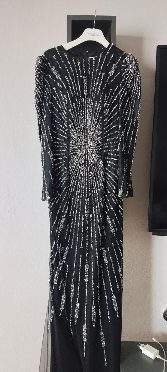 Boncuk işlemeli, V yakalı ve uzun kollu siyah uzun abiye elbise. Avant-garde goth tarzıyla parti için uygun, vücuda oturan kesim.