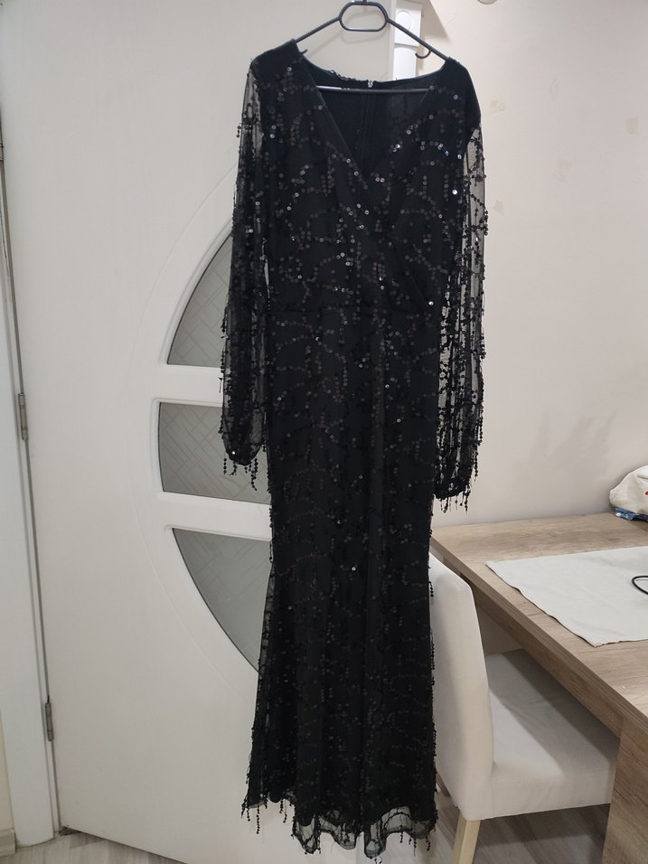 Siyah uzun abiye elbise, boncuk işlemeli, desenli, uzun kollu ve V yaka tasarıma sahiptir. Gevşek kesimiyle gotik ve avangart tarzı yansıtır, parti için uygundur.
