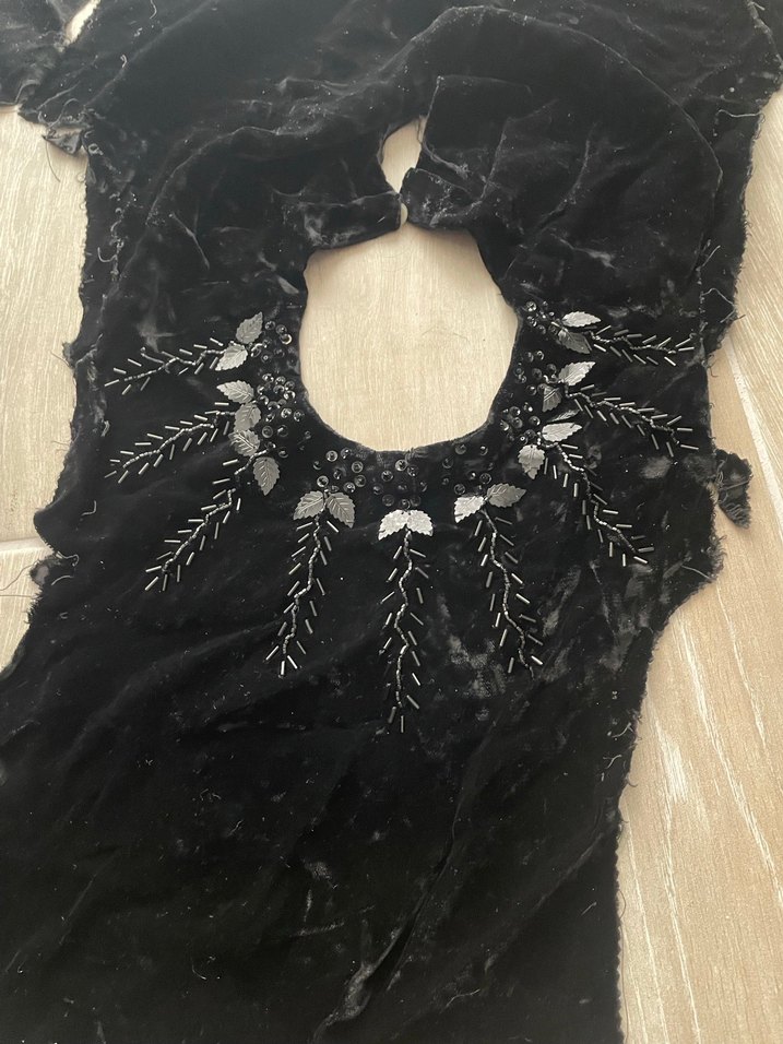 Dar kesim siyah abiye yakası .boncuk işlemeli nakış detaylarıyla süslenmiştir. Gotik tarzda, parti için uygundur. Antika değerindedir.elbise veya başka yerde kullanabilirsiniz. siyah kadife üzerine siyah boncuklarla işlenmiştir. yarın ayrıca kadife bir parça vardır.
