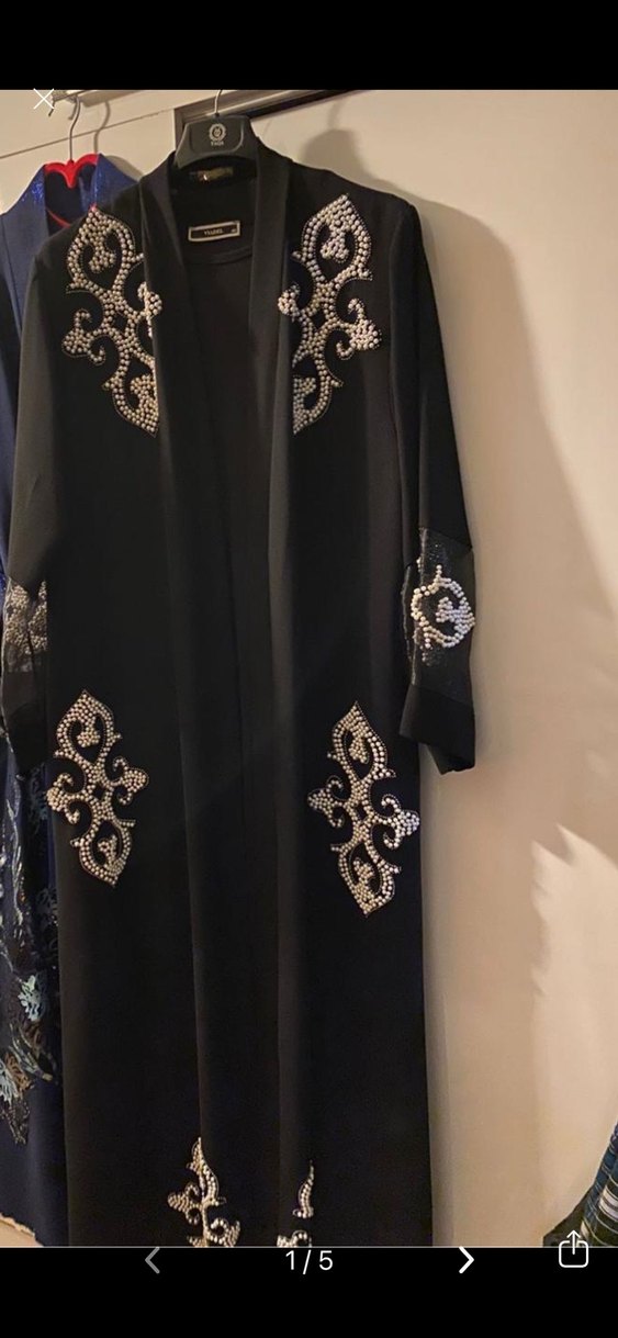 Boncuk işlemeli desenlerle süslenmiş, uzun kollu ve yakası kesik detaylı siyah abaya Sentetik kumaştan, bol kesim çok şık abaya