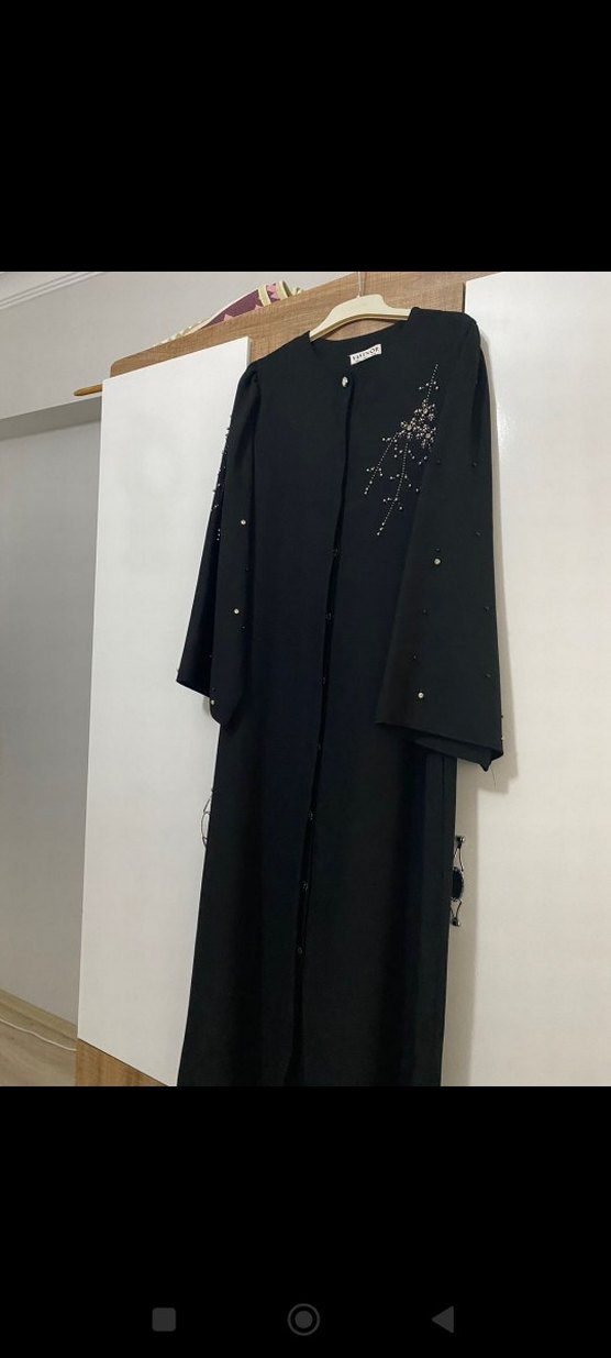 Boncuk işlemeli, işlemeli ve çıtçıtlı uzun siyah elbise. Uzun kollu, regular fit ve sentetik kumaştan, mütevazı gotik tarz için uygun.