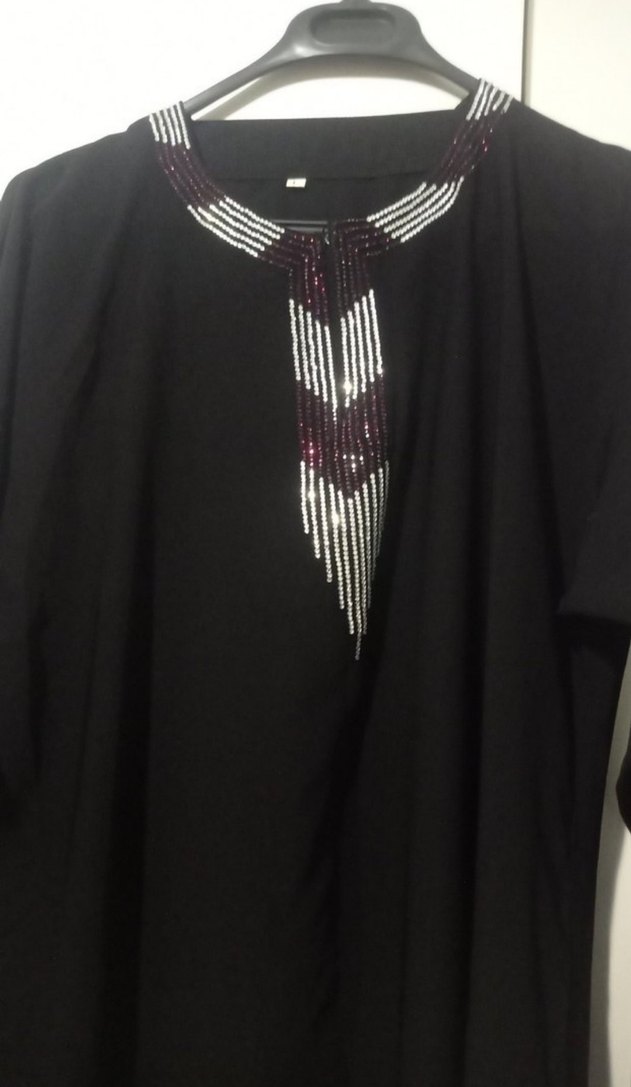 Siyah uzun elbise, V yaka ve beyaz ile koyu mor boncuk işlemeleriyle dikkat çeker. Uzun kollu, regular fit, sentetik kumaştan, mütevazı gotik tarz için uygundur.