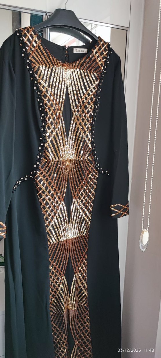 taş şişlemeli desenlere sahip, yuvarlak yaka ve uzun kollu siyah uzun elbise. Regular fit kesimiyle parti için uygundur. ✨şık ve gösterişi sevenlere gelsin .arka etek 1.75 uzundur hafif kuyruklu boy 1.60 koltuk altı sadece önden 50 cm